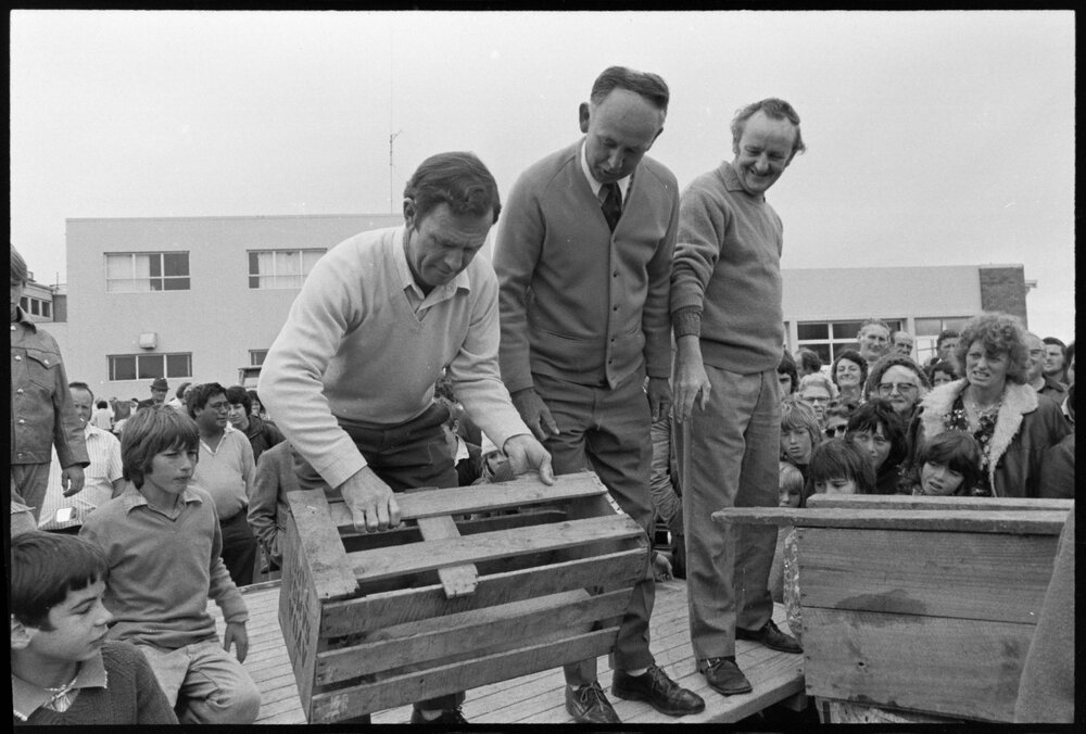 Date12 October 1974Reference Numberphoto gcc-25944DescriptionAnnual Lions Club auction at Te Puke. Pictured from left are John Broad, Sam Langdon (auctioneer) and Vernon Kean. Not published.FormatNegativePhysical Description35mm black-and-white negative (4/15)Photographer/CreatorBay of Plenty Times