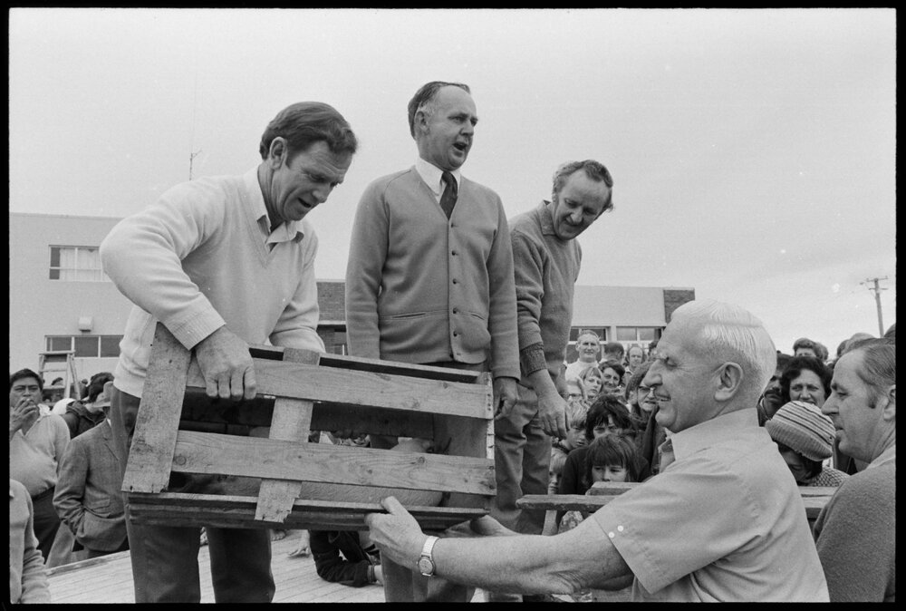Date12 October 1974Reference Numberphoto gcc-25945DescriptionAnnual Lions Club auction at Te Puke. Pictured from left are John Broad (passing crate to unidentified man), Sam Langdon (auctioneer) and Vernon Kean. Not published.FormatNegativePhysical Description35mm black-and-white negative (5/15)Photographer/CreatorBay of Plenty Times