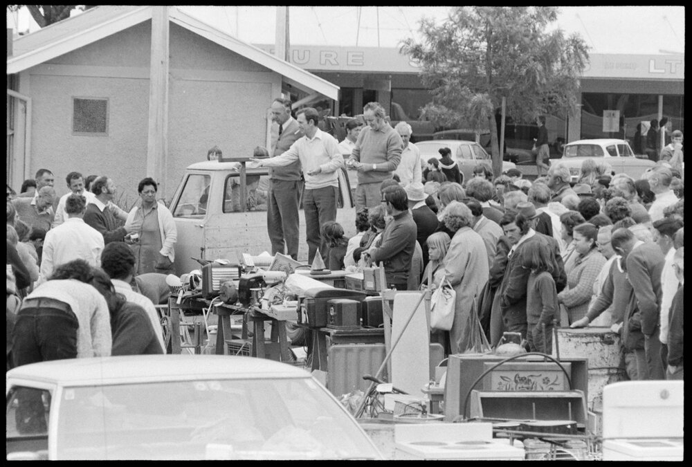 Date12 October 1974Reference Numberphoto gcc-25952DescriptionAnnual Lions Club auction at Te Puke. Pictured standing on truck from left are Sam Langdon (auctioneer), John Broad, and Vernon Kean. Not published.FormatNegativePhysical Description35mm black-and-white negative (12/15)Photographer/CreatorBay of Plenty Times