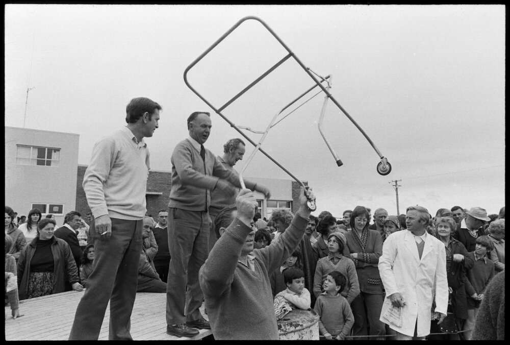 Date12 October 1974Reference Numberphoto gcc-25953DescriptionAnnual Lions Club auction at Te Puke. Pictured standing on truck from left are John Broad, Sam Langdon (auctioneer), and Vernon Kean. Not published.FormatNegativePhysical Description35mm black-and-white negative (13/15)Photographer/CreatorBay of Plenty Times