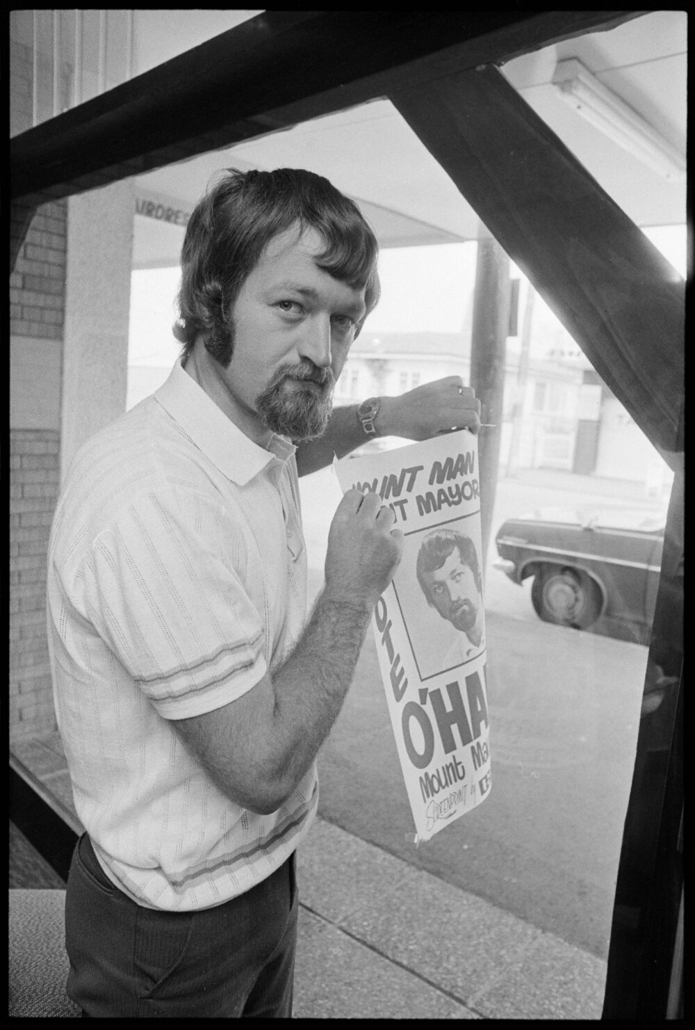 Kelvin O'Hara with election poster (14 October 1974). Pae Korokī, accessed 07/04/2026, https://paekoroki.tauranga.govt.nz/nodes/view/112252
