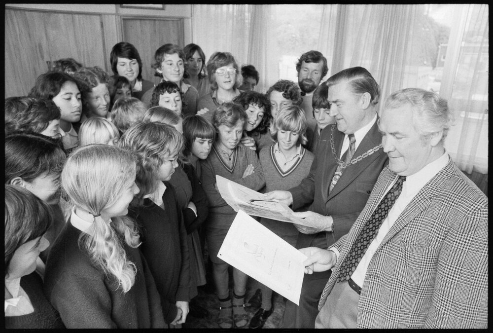 Date9 October 1974Reference Numberphoto gcc-26027DescriptionAnti-litter prizes. Form two pupils from Room 20 of the Ōtūmoetai Intermediate School look over the results of their "250 Questions" environmental project with Tauranga's Mayor, Mr. R. A. Owens (second from right) and 1ZD station manager, Mr. G. Haggitt, (right) after a presentation ceremony today.Published 9 October 1974.FormatNegativePhysical Description35mm black-and-white negative (1/5)Photographer/CreatorBay of Plenty Times