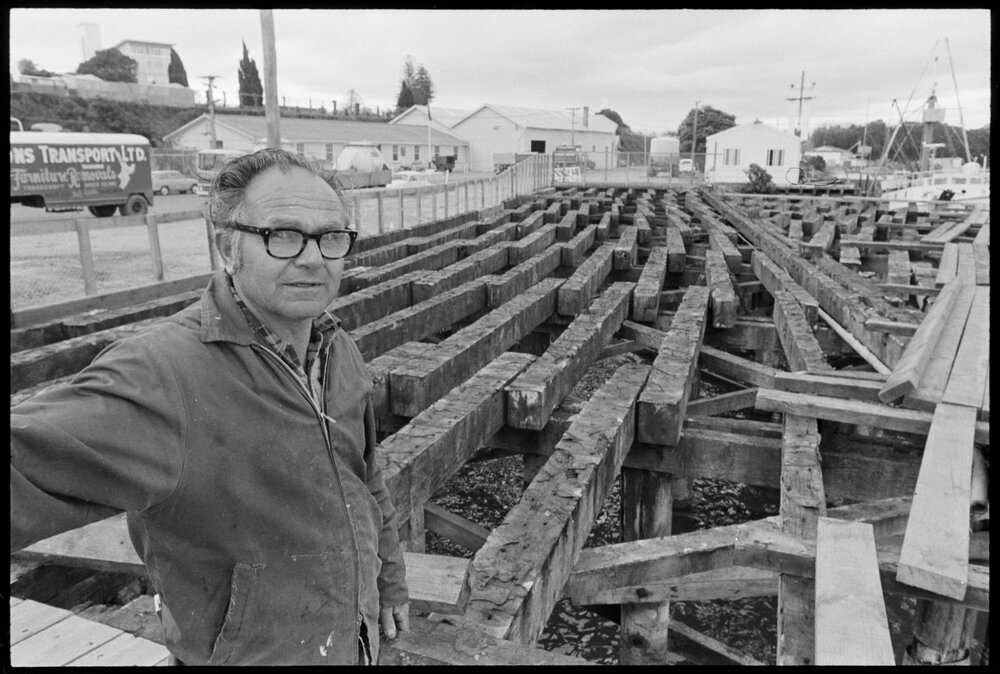 Date16 October 1974Reference Numberphoto gcc-26043DescriptionBay of Plenty Harbour Board carpenter, Mr K. R. Sadler, beside the northern section of the Tauranga Wharf. It has been fenced off pending a decision on its future use. Published 16 October 1974.FormatNegativePhysical Description35mm black-and-white negative (1/8)Photographer/CreatorBay of Plenty Times