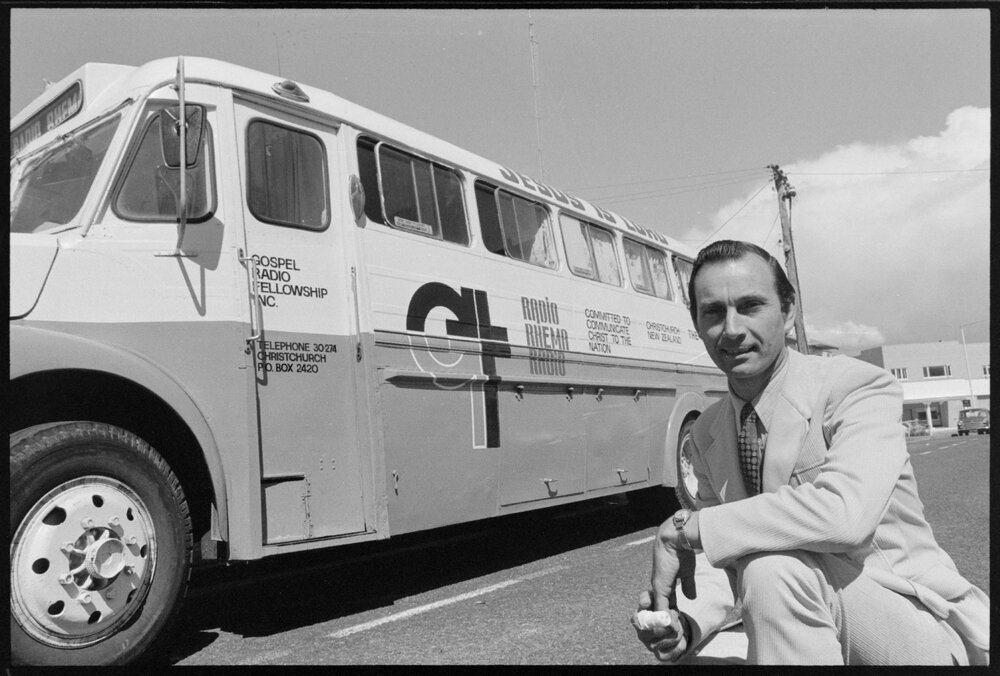 Date17 October 1974Reference Numberphoto gcc-26062DescriptionThe Radio Rhema campaign bus and Mr Neville Rush, currently touring New Zealand seeking support for a Christian "one way" radio station. The Radio Rhema group arrived in Tauranga earlier this week and is collecting signatures for a petition favouring a non-commercial Christian radio station in New Zealand. Published 17 October 1974.FormatNegativePhysical Description35mm black-and-white negative (6/6)Photographer/CreatorBay of Plenty Times