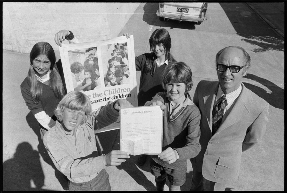 Date17 October 1974Reference Numberphoto gcc-26069DescriptionThe Rev M. Bowden stands with Form 2 prefects from the Ōtūmoetai Intermediate School after having thanked them as president of the Western Bay of Plenty branch of the Save the Children Fund for donating $60.05 to the fund. The money was collected over a period of a year in the school charity box. From left, Karyn Harvey, Alan Ware, Gill Whalen, Findlay Davidson and Mr Bowden. Published 17 October 1974.FormatNegativePhysical Description35mm black-and-white negative (1/6)Photographer/CreatorBay of Plenty Times