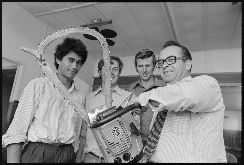Date18 October 1974Reference Numberphoto gcc-26079DescriptionA chainsaw demonstration with the accent on safety, maintenance and sharpening was given to a group of Bay of Plenty young farmers in the Tauriko Hall yesterday, by Mr H. Schilling, of Auckland. Observing a bow saw are from left to right, Messrs. P. Monaghan, A. Gorringe, S. Connolly and H. Schilling.. Published 18 October 1974.FormatNegativePhysical Description35mm black-and-white negative (1/6)Photographer/CreatorBay of Plenty Times