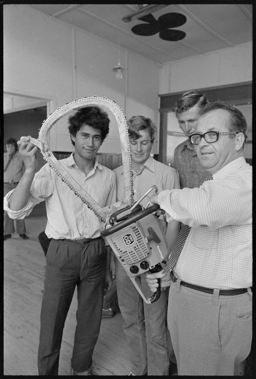 Date18 October 1974Reference Numberphoto gcc-26080DescriptionA chainsaw demonstration with the accent on safety, maintenance and sharpening was given to a group of Bay of Plenty young farmers in the Tauriko Hall yesterday, by Mr H. Schilling, of Auckland. Observing a bow saw are from left to right, Messrs. P. Monaghan, A. Gorringe, S. Connolly and H. Schilling.. Published 18 October 1974.FormatNegativePhysical Description35mm black-and-white negative (2/6)Photographer/CreatorBay of Plenty Times