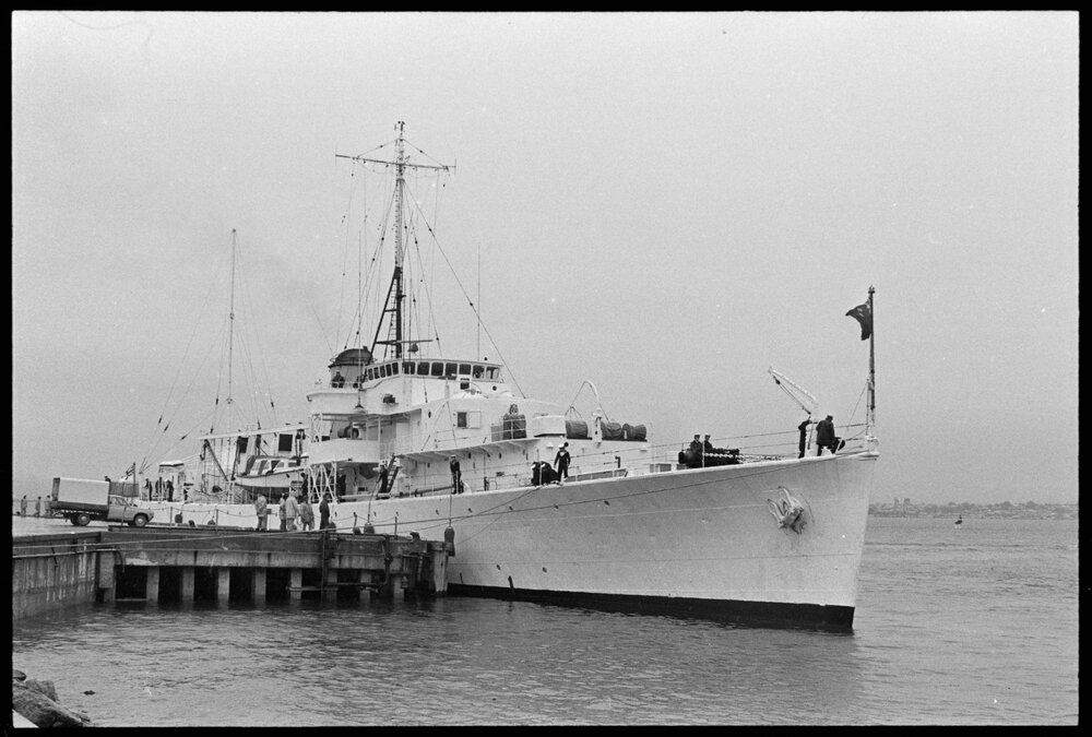 Date19 October 1974Reference Numberphoto gcc-26106DescriptionHMNZS Lachlan, which is on its final visit to the Port of Tauranga, will be open to public inspection tomorrow afternoon. During the veteran survey ship’s four-day stay, its crew will be involved in sporting activities with various local groups. The ship will be paid off as an active naval unit in December. Published 19 October 1974.FormatNegativePhysical Description35mm black-and-white negative (10/18)Photographer/CreatorBay of Plenty Times