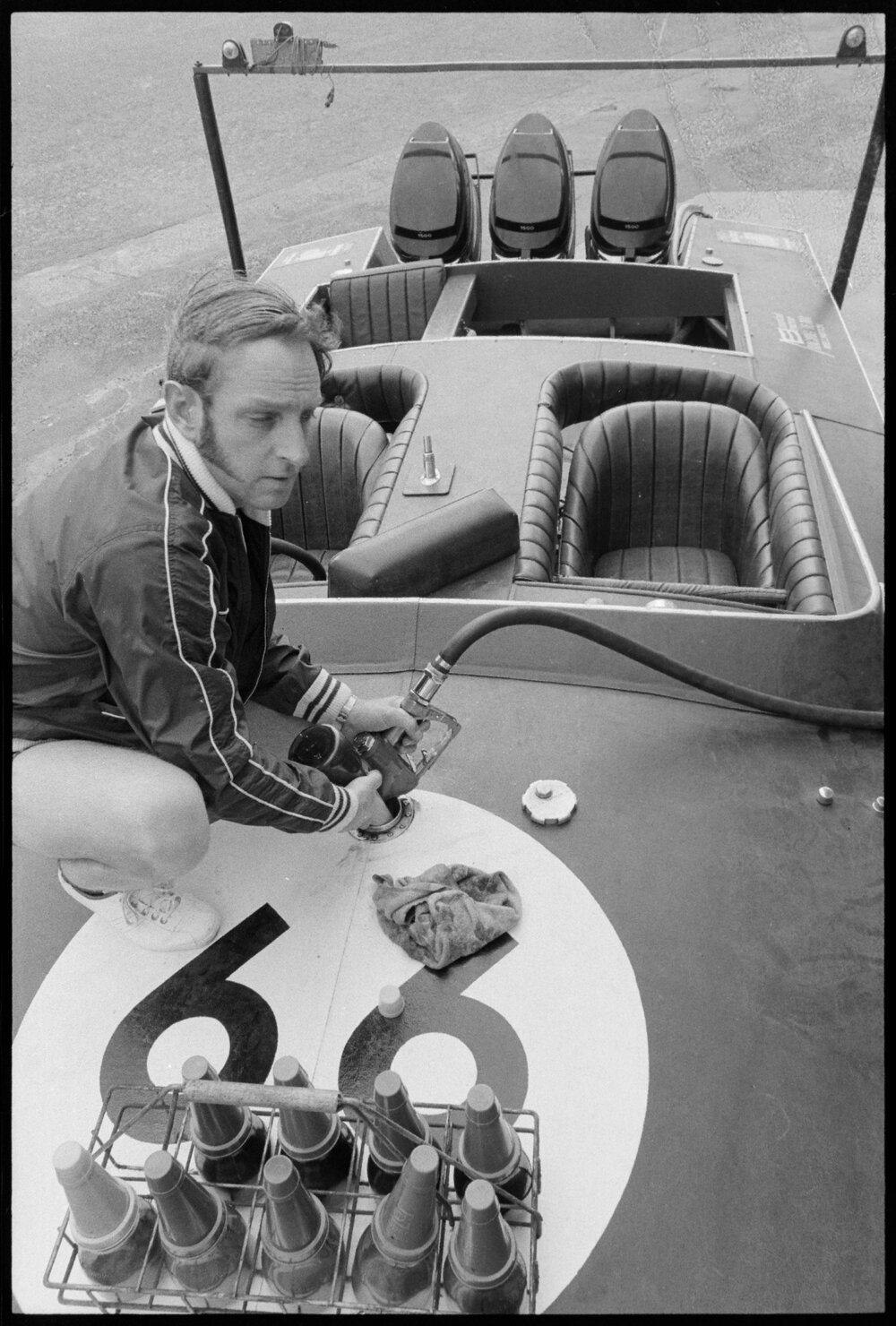 Date19 October 1974Reference Numberphoto gcc-26115DescriptionA crew member helps fill the Wellington boat 'Raro Orange' with high-octane fuel to power the craft on the 180-mile power boat race this afternoon. Published 19 October 1974.FormatNegativePhysical Description35mm black-and-white negative (1/9)Photographer/CreatorBay of Plenty Times