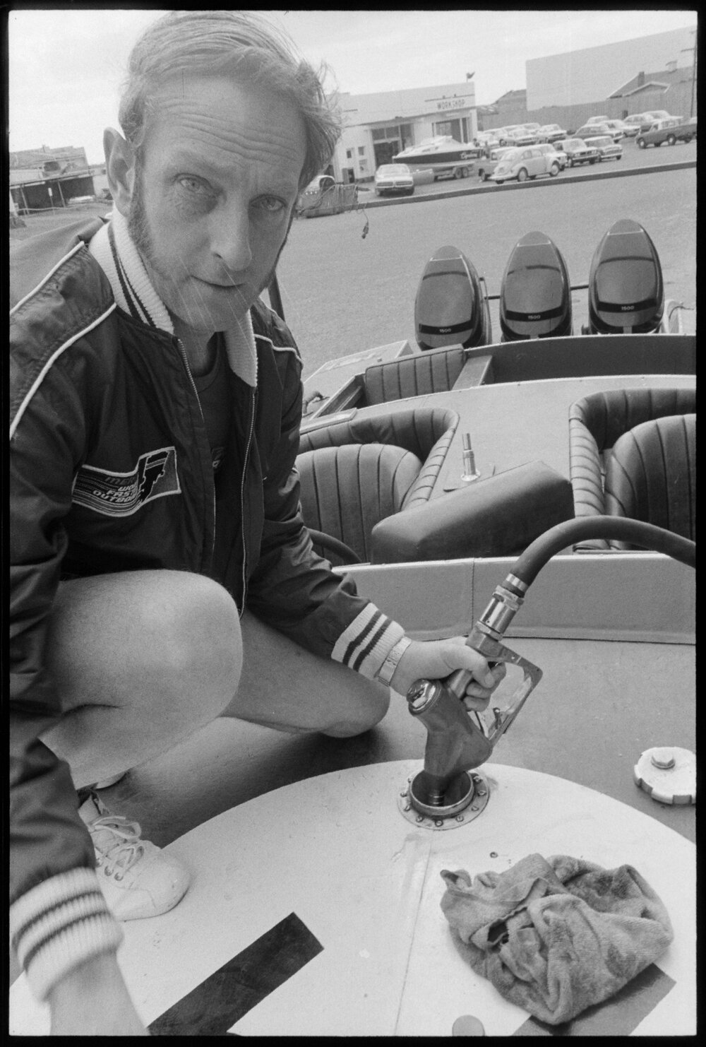 Date19 October 1974Reference Numberphoto gcc-26119DescriptionA crew member helps fill the Wellington boat 'Raro Orange' with high-octane fuel to power the craft on the 180-mile power boat race this afternoon. Published 19 October 1974.FormatNegativePhysical Description35mm black-and-white negative (5/9)Photographer/CreatorBay of Plenty Times