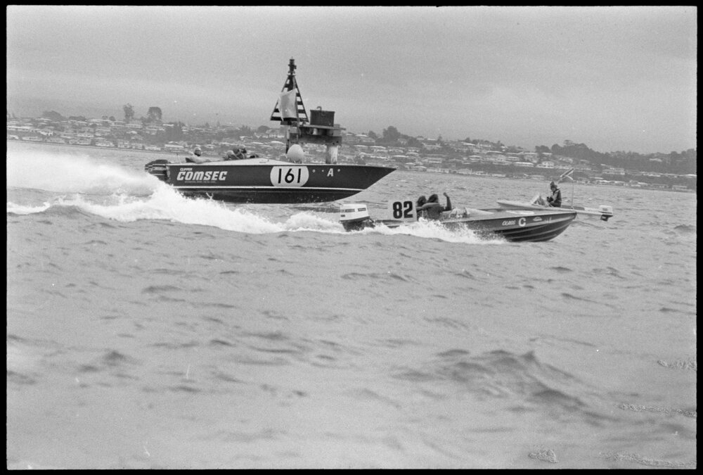 Date21 October 1974Reference Numberphoto gcc-26127DescriptionWith a hiss and a roar, 25 power boats splashed off on the 60-mile inner harbour power boat race. Some of the entrants are seen here soon after the flag dropped. Published 19 October 1974.FormatNegativePhysical Description35mm black-and-white negative (1/3)Photographer/CreatorBay of Plenty Times