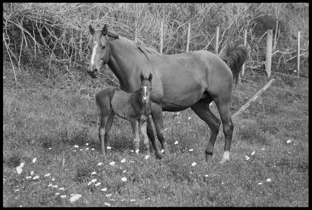 Date21 October 1974Reference Numberphoto gcc-26132DescriptionTwo-day old colt by the former brilliant galloper, Bardall makes sure his dam, Neander Queen, is close at hand when pictured at the farm of his owner, Mr Fred Cooper, at Ōropi this morning. The colt is among the first crop of Bardall, one of the country's top weight-for-age gallopers several seasons ago. Published 21 October 1974.FormatNegativePhysical Description35mm black-and-white negative (3/15)Photographer/CreatorBay of Plenty Times
