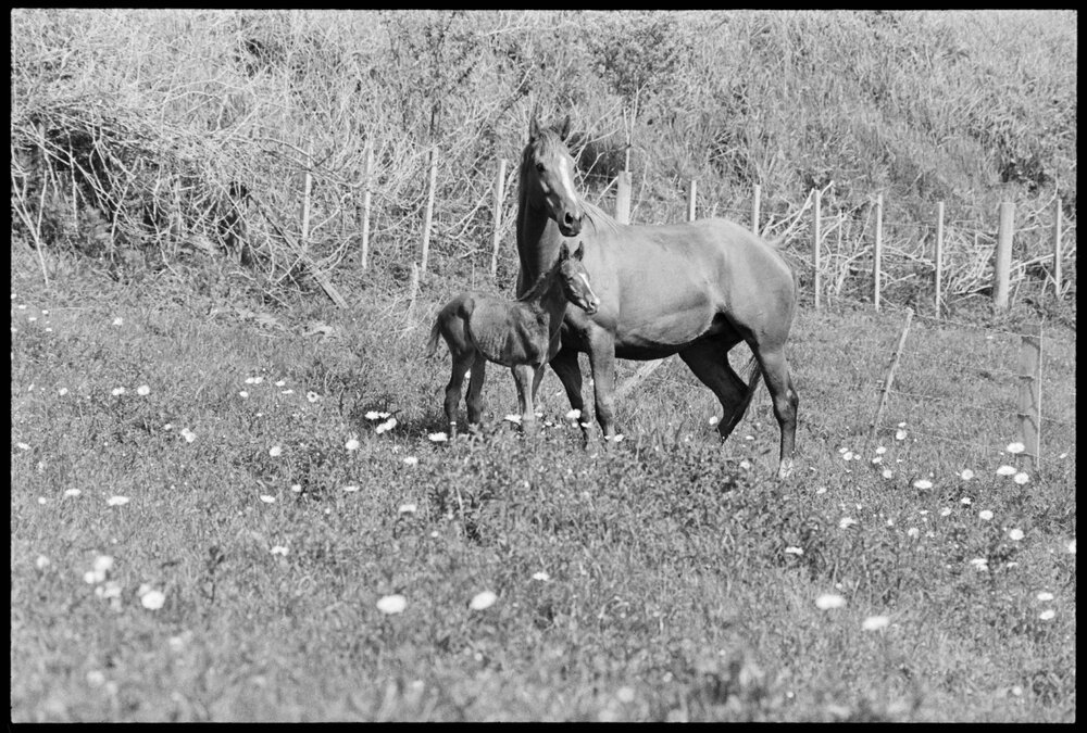 Date21 October 1974Reference Numberphoto gcc-26143DescriptionTwo-day old colt by the former brilliant galloper, Bardall makes sure his dam, Neander Queen, is close at hand when pictured at the farm of his owner, Mr Fred Cooper, at Ōropi this morning. The colt is among the first crop of Bardall, one of the country's top weight-for-age gallopers several seasons ago. Published 21 October 1974.FormatNegativePhysical Description35mm black-and-white negative (14/15)Photographer/CreatorBay of Plenty Times
