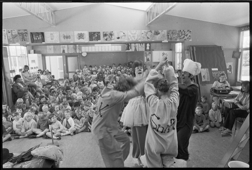 Date22 October 1974Reference Numberphoto gcc-26160DescriptionMatua School pupils watch entranced as Scott Broad, playing Horn, gestures during the play "Nobody's From Nowhere," which the Gateway Players are presenting at Tauranga primary and intermediate schools this week. Published 22 October 1974.FormatNegativePhysical Description35mm black-and-white negative (4/12)Photographer/CreatorBay of Plenty Times