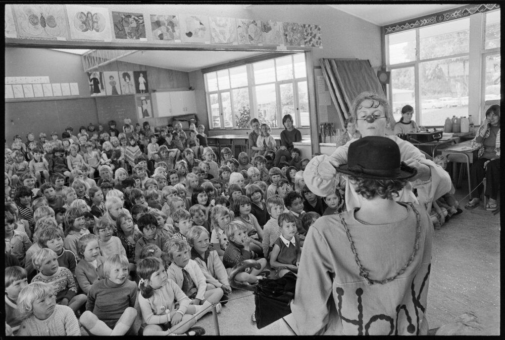 Date22 October 1974Reference Numberphoto gcc-26165DescriptionMatua School pupils watch entranced as Scott Broad, playing Horn, gestures during the play "Nobody's From Nowhere," which the Gateway Players are presenting at Tauranga primary and intermediate schools this week. Published 22 October 1974.FormatNegativePhysical Description35mm black-and-white negative (9/12)Photographer/CreatorBay of Plenty Times