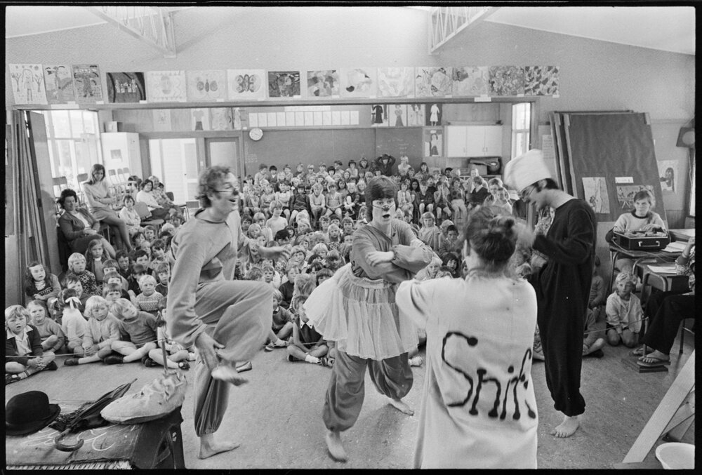 Date22 October 1974Reference Numberphoto gcc-26166DescriptionMatua School pupils watch entranced as Scott Broad, playing Horn, gestures during the play "Nobody's From Nowhere," which the Gateway Players are presenting at Tauranga primary and intermediate schools this week. Published 22 October 1974.FormatNegativePhysical Description35mm black-and-white negative (10/12)Photographer/CreatorBay of Plenty Times