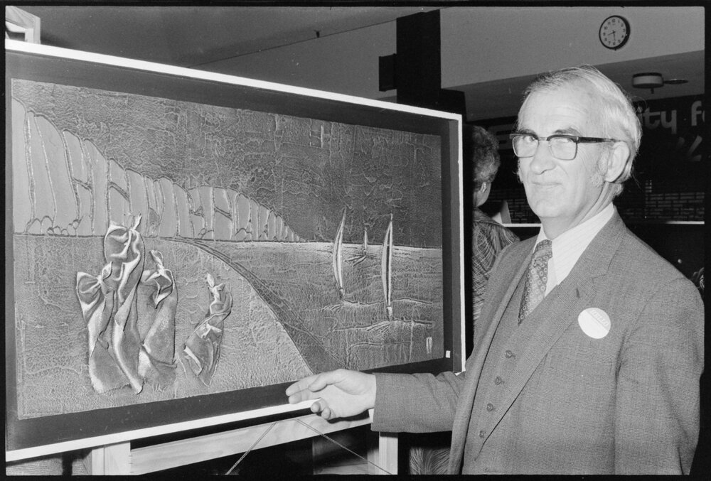 Date24 October 1974Reference Numberphoto gcc-26201DescriptionMr D. Wilson, SM, next to an art work exhibited at Fountain Court in Devon Mall. Published 24 October 1974.FormatNegativePhysical Description35mm black-and-white negative (1/9)Photographer/CreatorBay of Plenty Times