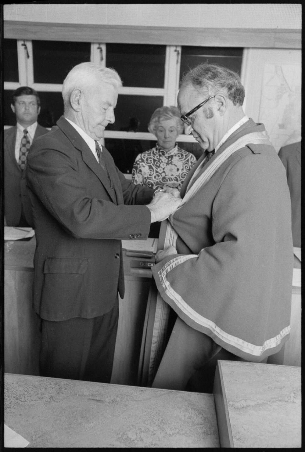 Date24 October 1974Reference Numberphoto gcc-26222DescriptionThe last act of Mr. E. H. Raymond, M.B.E., after 18 years as mayor of Te Puke, was to transfer his chain of office to his successor, Mr. R. Johnson, when the new Te Puke Borough Council was sworn in last night. Published 24 October 1974.FormatNegativePhysical Description35mm black-and-white negative (1/9)Photographer/CreatorBay of Plenty Times