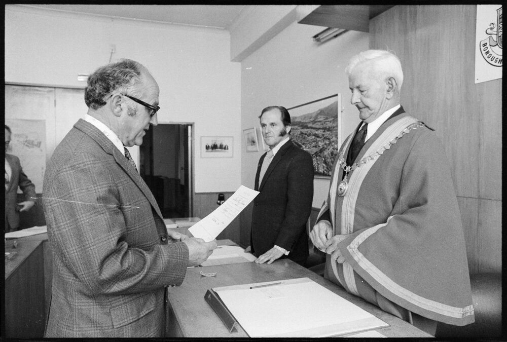 Date24 October 1974Reference Numberphoto gcc-26225DescriptionThe last act of Mr. E. H. Raymond, M.B.E., after 18 years as mayor of Te Puke, was to transfer his chain of office to his successor, Mr. R. Johnson, when the new Te Puke Borough Council was sworn in last night. Published 24 October 1974.FormatNegativePhysical Description35mm black-and-white negative (4/9)Photographer/CreatorBay of Plenty Times