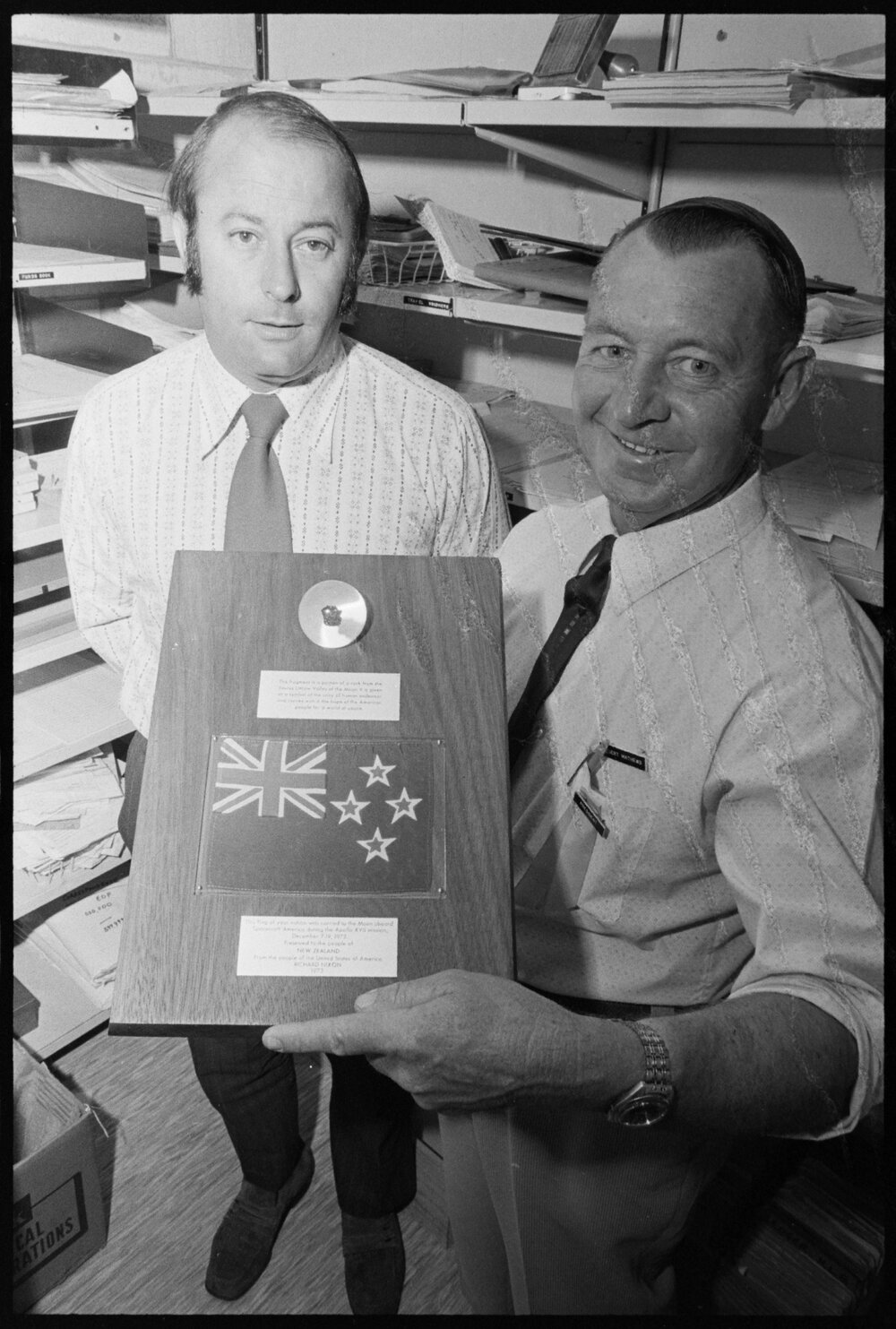 Date25 October 1974Reference Numberphoto gcc-26243DescriptionThis tiny sample of moon rock, displayed on a plaque, with a New Zealand ensign carried on one of the United States moon exploration voyages, will take pride of place in the Tauranga Rock and Mineral Club's Labour Weekend display at Mount Maunganui. Seen here with the exhibit are Messrs J. C. Beauchamp, the manager of the Mount Branch of the Bay of Plenty Savings Bank, where the rock has been held for security, and A. E. Mathews, the club president. Published 25 October 1974.FormatNegativePhysical Description35mm black-and-white negative (1/6)Photographer/CreatorBay of Plenty Times