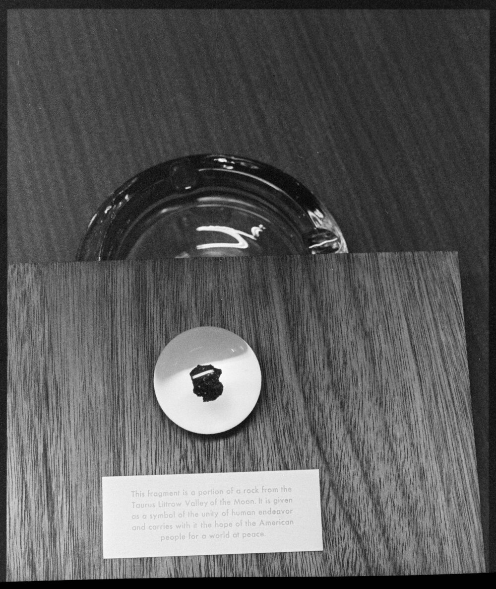 Date25 October 1974Reference Numberphoto gcc-26245DescriptionThis tiny sample of moon rock, displayed on a plaque, with a New Zealand ensign carried on one of the United States moon exploration voyages, will take pride of place in the Tauranga Rock and Mineral Club's Labour Weekend display at Mount Maunganui. Seen here with the exhibit are Messrs J. C. Beauchamp, the manager of the Mount Branch of the Bay of Plenty Savings Bank, where the rock has been held for security, and A. E. Mathews, the club president. Published 25 October 1974.FormatNegativePhysical Description35mm black-and-white negative (3/6)Photographer/CreatorBay of Plenty Times