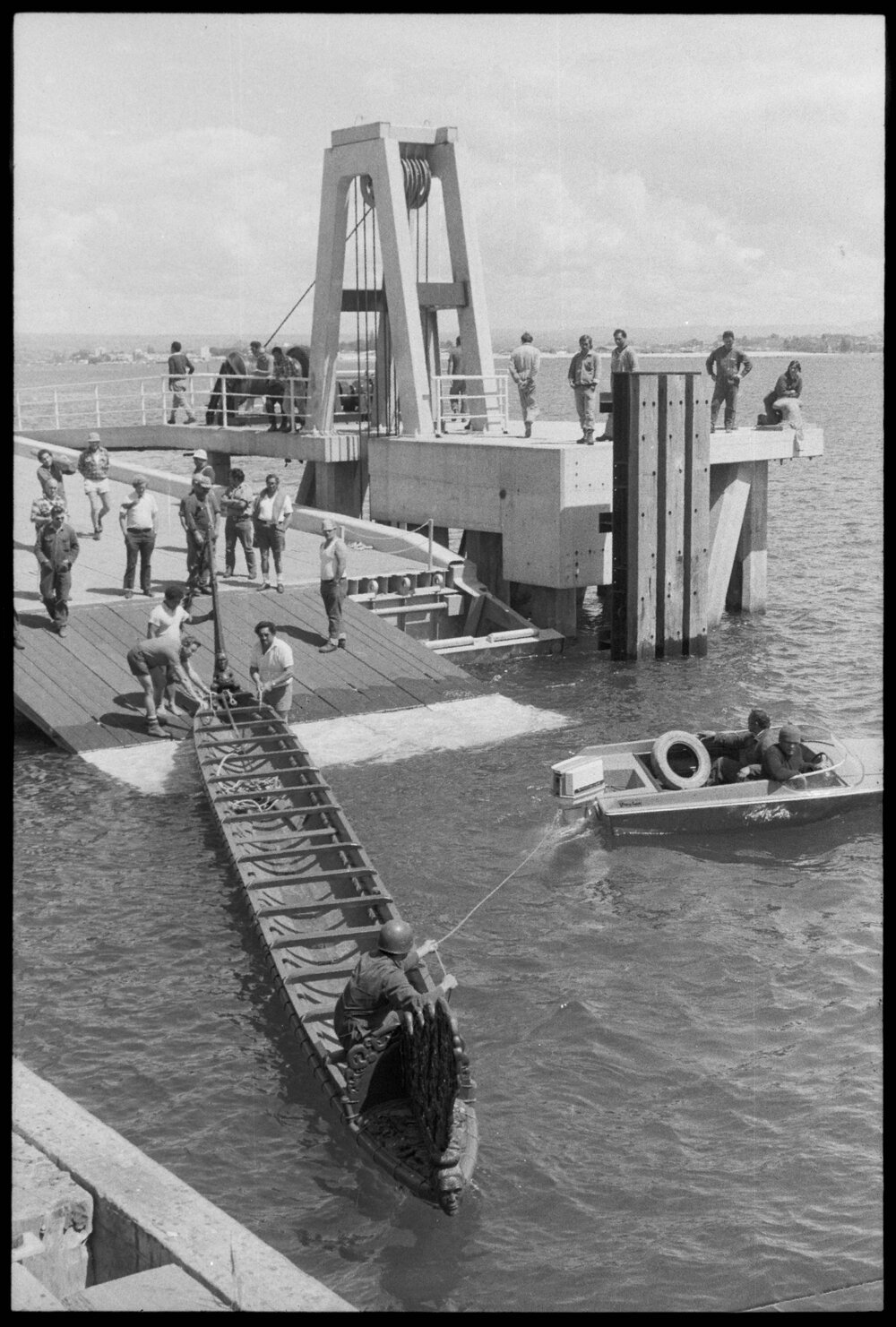 Date25 October 1974Reference Numberphoto gcc-26255DescriptionThe Te Awanui waka, christened the Bay of Plenty Harbour Board's new roll-on-roll-off link span yesterday when it was hauled on to dry land after a trip across the harbour under tow. The canoe is being featured at the Tauranga Rock and Mineral Club's annual exhibition in the Mount Maunganui sports stadium. It will be placed alongside a piece of moon-rock lent to the club by the National Museum. Docking at the link span proved a little tricky in the fresh breeze and tidal rip but with the concerted effort of many hands the canoe was finally dragged out of the water. Published 25 October 1974.FormatNegativePhysical Description35mm black-and-white negative (7/15)Photographer/CreatorBay of Plenty Times