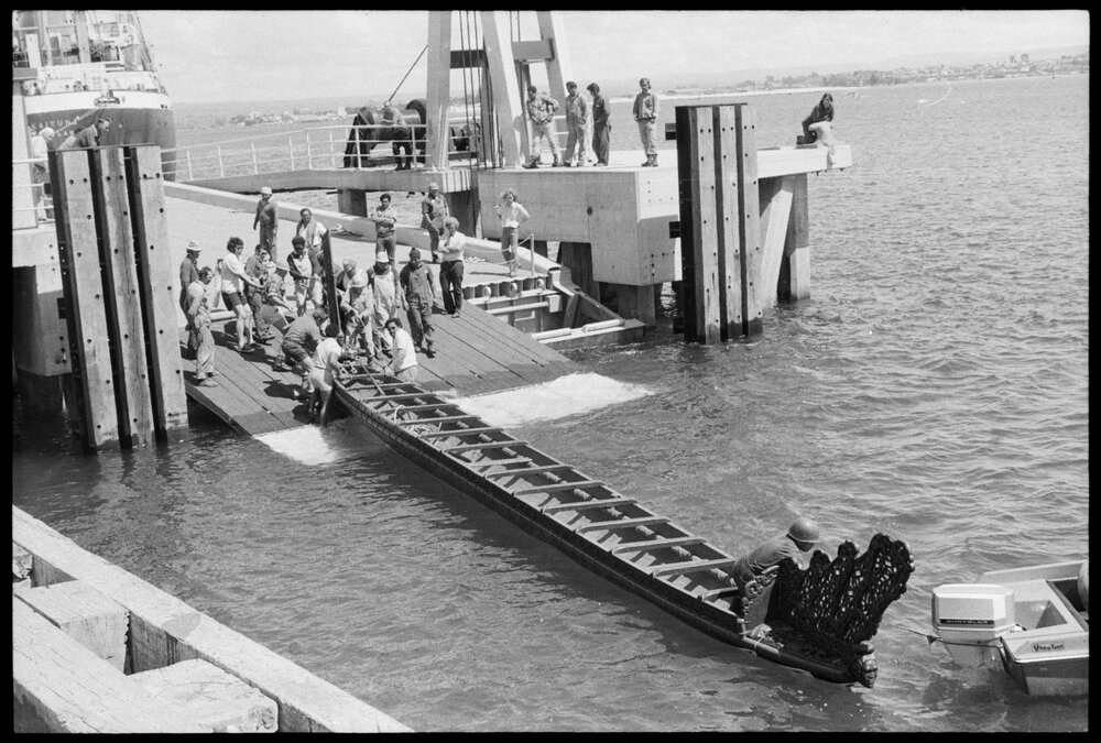Date25 October 1974Reference Numberphoto gcc-26256DescriptionThe Te Awanui waka, christened the Bay of Plenty Harbour Board's new roll-on-roll-off link span yesterday when it was hauled on to dry land after a trip across the harbour under tow. The canoe is being featured at the Tauranga Rock and Mineral Club's annual exhibition in the Mount Maunganui sports stadium. It will be placed alongside a piece of moon-rock lent to the club by the National Museum. Docking at the link span proved a little tricky in the fresh breeze and tidal rip but with the concerted effort of many hands the canoe was finally dragged out of the water. Published 25 October 1974.FormatNegativePhysical Description35mm black-and-white negative (8/15)Photographer/CreatorBay of Plenty Times
