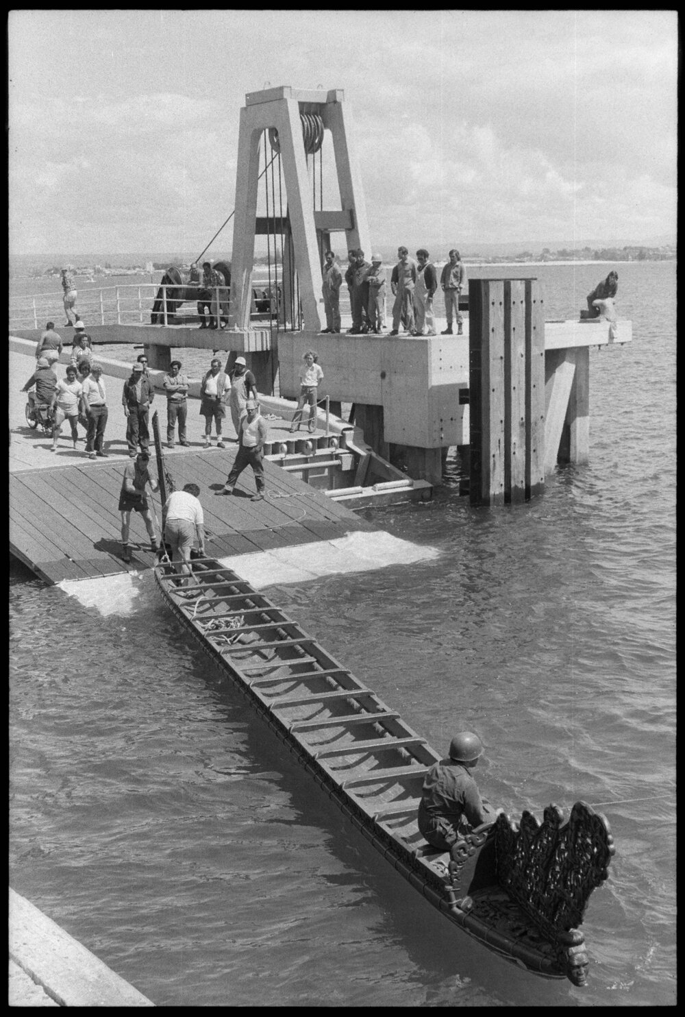 Date25 October 1974Reference Numberphoto gcc-26260DescriptionThe Te Awanui waka, christened the Bay of Plenty Harbour Board's new roll-on-roll-off link span yesterday when it was hauled on to dry land after a trip across the harbour under tow. The canoe is being featured at the Tauranga Rock and Mineral Club's annual exhibition in the Mount Maunganui sports stadium. It will be placed alongside a piece of moon-rock lent to the club by the National Museum. Docking at the link span proved a little tricky in the fresh breeze and tidal rip but with the concerted effort of many hands the canoe was finally dragged out of the water. Published 25 October 1974.FormatNegativePhysical Description35mm black-and-white negative (12/15)Photographer/CreatorBay of Plenty Times