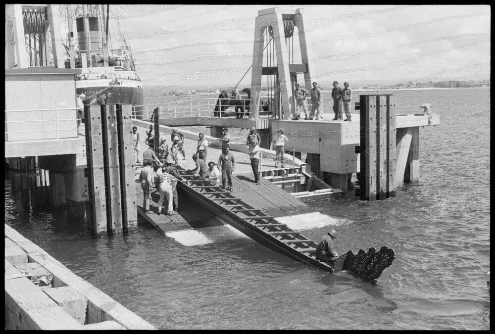 Date25 October 1974Reference Numberphoto gcc-26261DescriptionThe Te Awanui waka, christened the Bay of Plenty Harbour Board's new roll-on-roll-off link span yesterday when it was hauled on to dry land after a trip across the harbour under tow. The canoe is being featured at the Tauranga Rock and Mineral Club's annual exhibition in the Mount Maunganui sports stadium. It will be placed alongside a piece of moon-rock lent to the club by the National Museum. Docking at the link span proved a little tricky in the fresh breeze and tidal rip but with the concerted effort of many hands the canoe was finally dragged out of the water. Published 25 October 1974.FormatNegativePhysical Description35mm black-and-white negative (13/15)Photographer/CreatorBay of Plenty Times