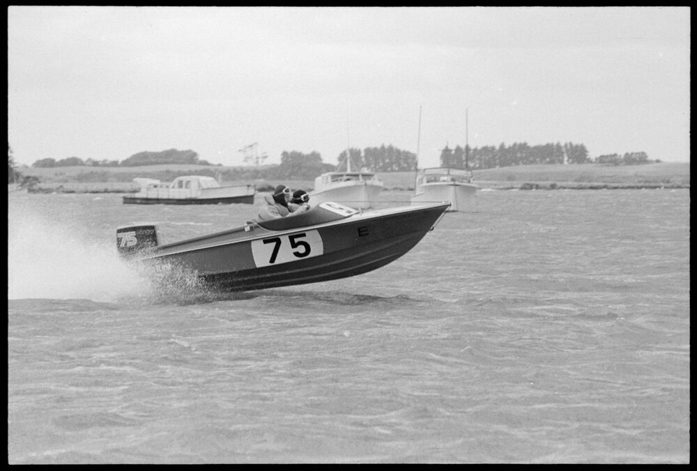 Date26 October 1974Reference Numberphoto gcc-26267DescriptionCompeting boat in the class A in the 100-mile power run in the Tauranga Harbour on Saturday. Published 25 October 1974.FormatNegativePhysical Description35mm black-and-white negative (1/3)Photographer/CreatorBay of Plenty Times