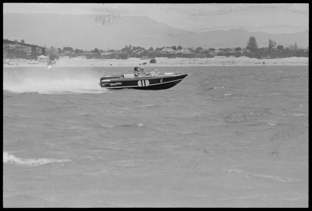 Date26 October 1974Reference Numberphoto gcc-26268DescriptionProvisional winner of the 60-mile race, the 16ft Head Hunter is almost hidden by spray as she motors on for a race average of 45.71 mph. Driven by Ron Archer of Auckland, Head Hunter is powered by a hotted-up 200hp Volvo Penta outdrive, unlike the majority of the other entries which was outboard motors. Published 26 October 1974.FormatNegativePhysical Description35mm black-and-white negative (2/3)Photographer/CreatorBay of Plenty Times