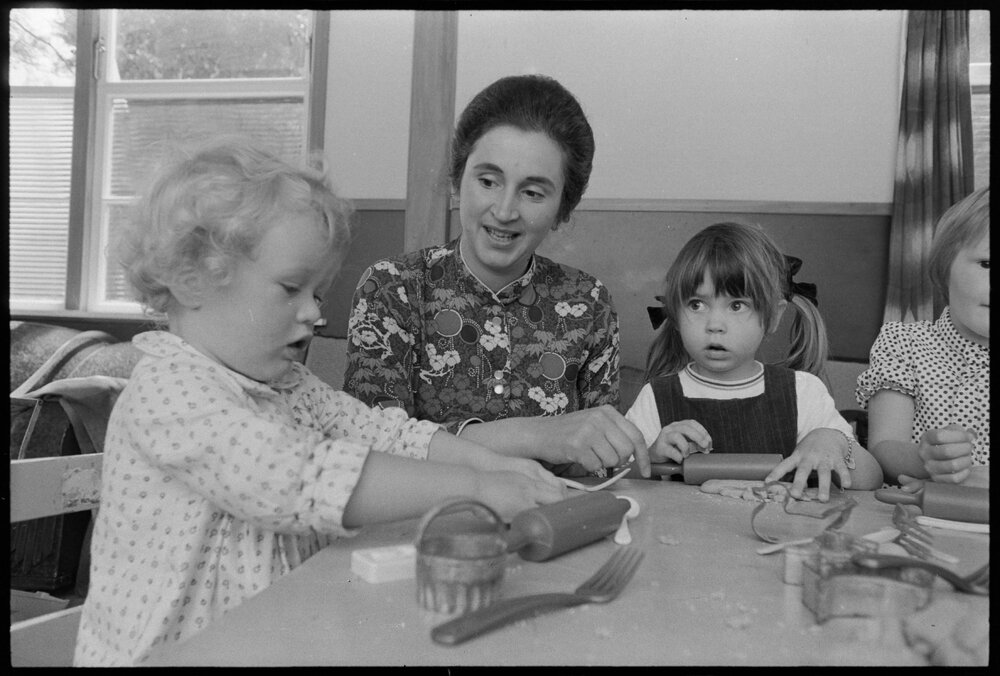 Date26 October 1974Reference Numberphoto gcc-26280DescriptionSitting down for a good talk at the Holy Trinity Church creche in Devonport Road are (from left): Louise (2), Mrs Jennifer Lord and Nicola (3). Published 26 October 1974. Published 26 October 1974.FormatNegativePhysical Description35mm black-and-white negative (8/9)Photographer/CreatorBay of Plenty Times