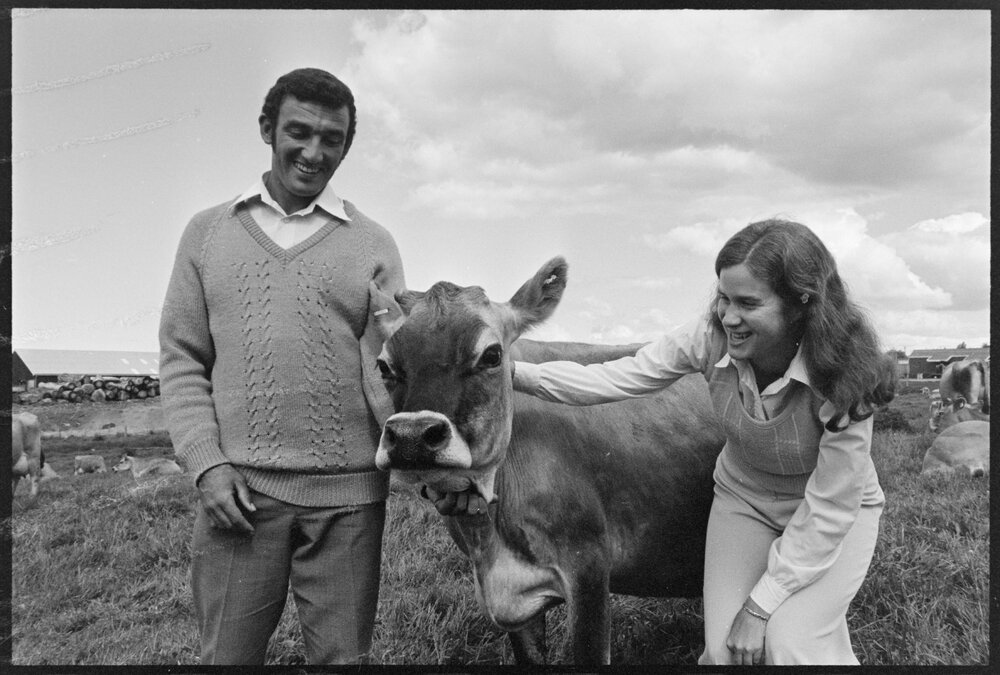 Date26 October 1974Reference Numberphoto gcc-26289DescriptionMr. D. Marshall, chairman, of the Te Puke Young Farmers' Club introduces one of his pedigree Jersey cows to Nancy Massie, New Zealand's latest 4-H exchange student from Virginia, U.S.A. Published 26 October 1974.FormatNegativePhysical Description35mm black-and-white negative (8/9)Photographer/CreatorBay of Plenty Times