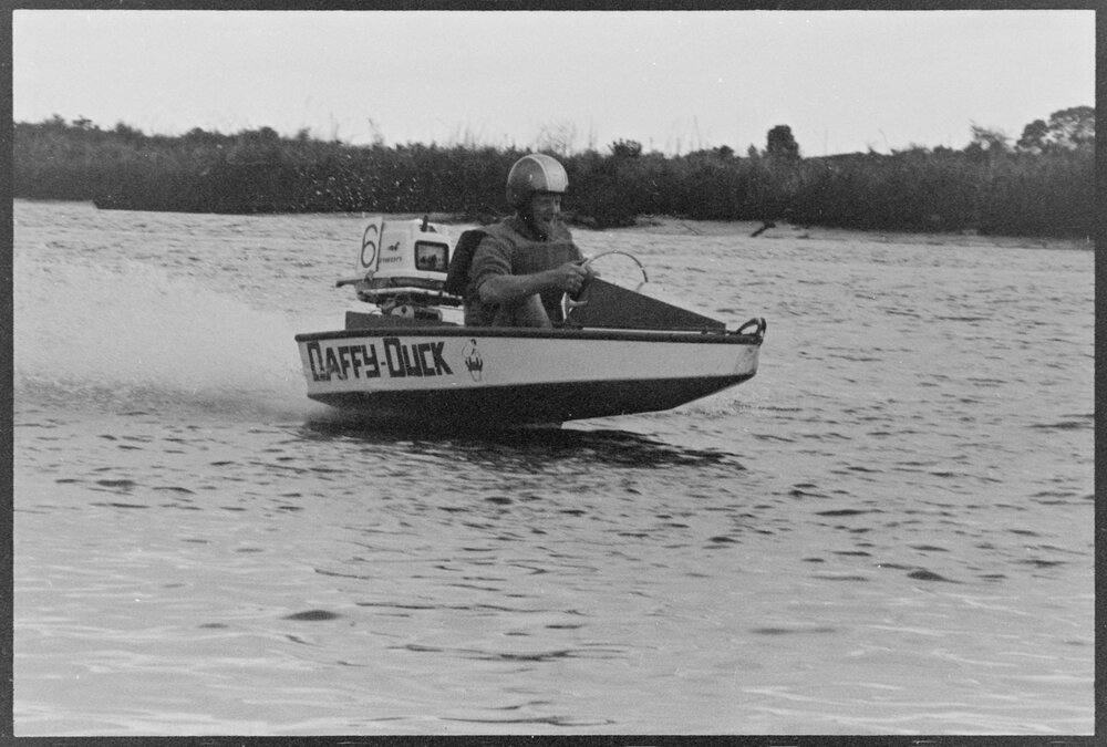 Date26 October 1974Reference Numberphoto gcc-26291DescriptionSpray flies as Tauranga Mini Speedboat Club president W. I. Fairbrother drives his 8 ft, 18hp Daffy Duck across the Wairoa River on club racing day. Published 26 October 1974.FormatNegativePhysical Description35mm black-and-white negative (1/14)Photographer/CreatorBay of Plenty Times