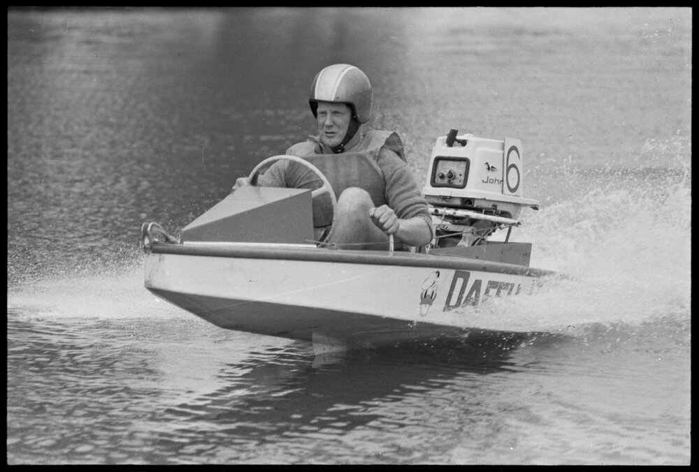 Date26 October 1974Reference Numberphoto gcc-26293DescriptionSpray flies as Tauranga Mini Speedboat Club president W. I. Fairbrother drives his 8 ft, 18hp Daffy Duck across the Wairoa River on club racing day. Published 26 October 1974.FormatNegativePhysical Description35mm black-and-white negative (3/14)Photographer/CreatorBay of Plenty Times