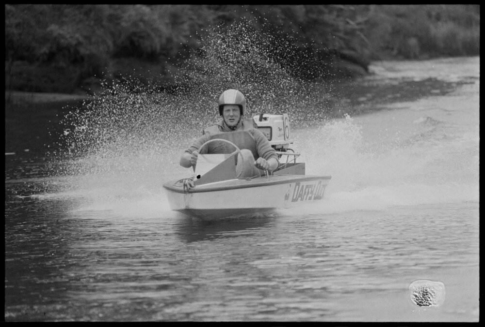 Date26 October 1974Reference Numberphoto gcc-26295DescriptionSpray flies as Tauranga Mini Speedboat Club president W. I. Fairbrother drives his 8 ft, 18hp Daffy Duck across the Wairoa River on club racing day. Published 26 October 1974.FormatNegativePhysical Description35mm black-and-white negative (5/14)Photographer/CreatorBay of Plenty Times