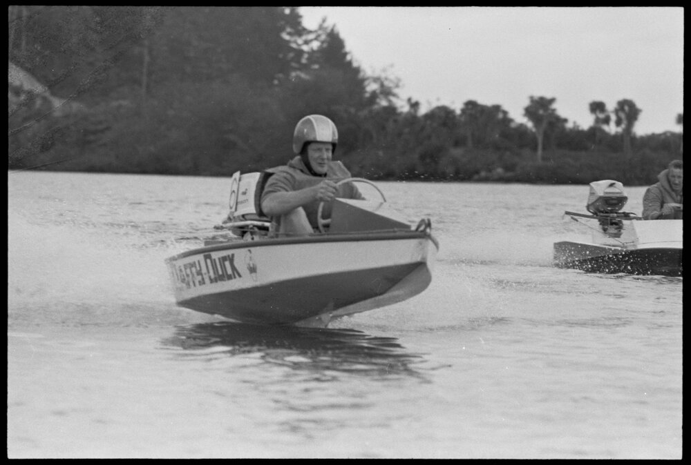 Date26 October 1974Reference Numberphoto gcc-26296DescriptionSpray flies as Tauranga Mini Speedboat Club president W. I. Fairbrother drives his 8 ft, 18hp Daffy Duck across the Wairoa River on club racing day. Published 26 October 1974.FormatNegativePhysical Description35mm black-and-white negative (6/14)Photographer/CreatorBay of Plenty Times