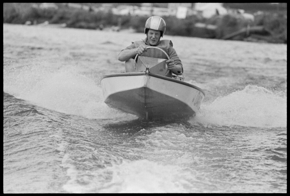 Date26 October 1974Reference Numberphoto gcc-26297DescriptionSpray flies as Tauranga Mini Speedboat Club president W. I. Fairbrother drives his 8 ft, 18hp Daffy Duck across the Wairoa River on club racing day. Published 26 October 1974.FormatNegativePhysical Description35mm black-and-white negative (7/14)Photographer/CreatorBay of Plenty Times