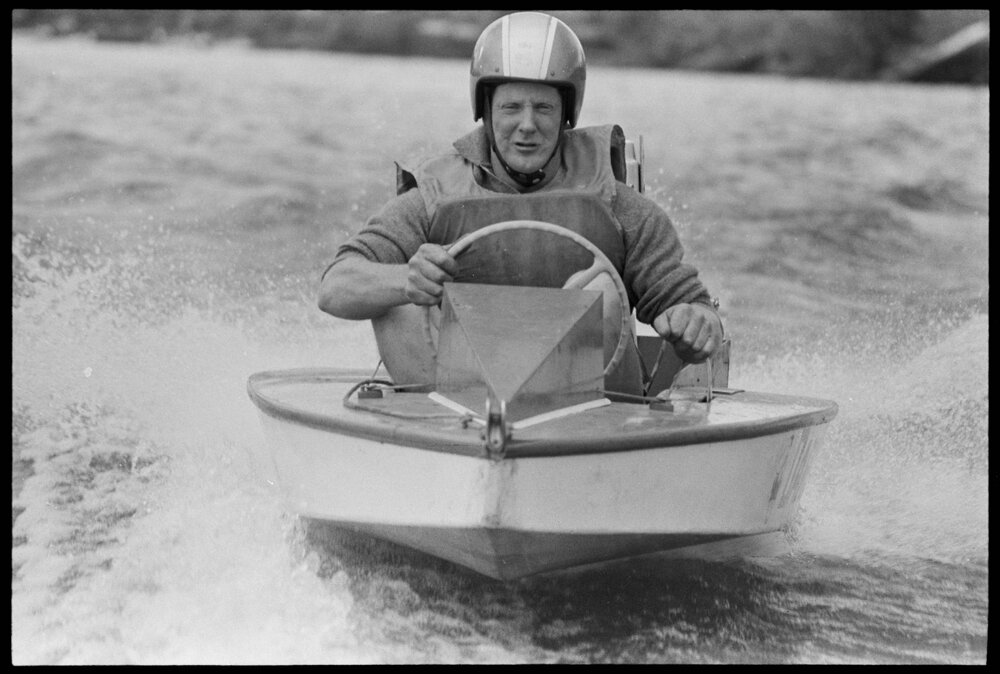 Date26 October 1974Reference Numberphoto gcc-26298DescriptionSpray flies as Tauranga Mini Speedboat Club president W. I. Fairbrother drives his 8 ft, 18hp Daffy Duck across the Wairoa River on club racing day. Published 26 October 1974.FormatNegativePhysical Description35mm black-and-white negative (8/14)Photographer/CreatorBay of Plenty Times