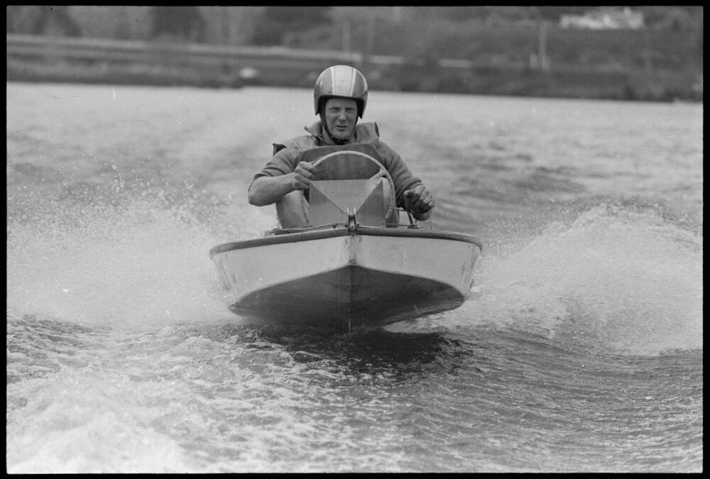 Date26 October 1974Reference Numberphoto gcc-26302DescriptionSpray flies as Tauranga Mini Speedboat Club president W. I. Fairbrother drives his 8 ft, 18hp Daffy Duck across the Wairoa River on club racing day. Published 26 October 1974.FormatNegativePhysical Description35mm black-and-white negative (12/14)Photographer/CreatorBay of Plenty Times