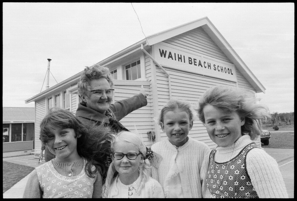 Date29 October 1974Reference Numberphoto gcc-26325DescriptionAttendees at the 50th anniversary of Waihī Beach School celebrations are: Mrs Olga Thompson (nee Berry), a foundation pupil, with current pupils - from left, Nadine Gay, Janessa Street, Susan Hardwicke and Rowena Gay. Published 29 October 1974FormatNegativePhysical Description35mm black-and-white negative (2/6)Photographer/CreatorBay of Plenty Times