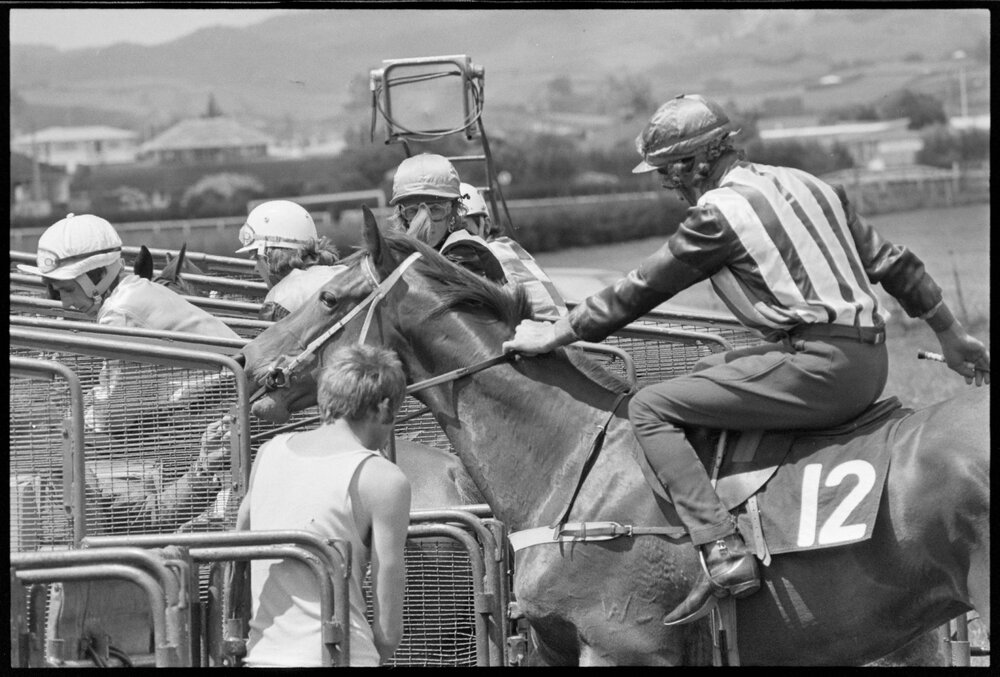 Date30 October 1974Reference Numberphoto gcc-26337DescriptionHorses at the gates, at the racecourse. Published 30 October 1974.FormatNegativePhysical Description35mm black-and-white negative (2/6)Photographer/CreatorBay of Plenty Times