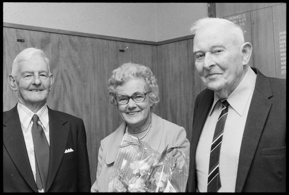 Date31 October 1974Reference Numberphoto gcc-26354DescriptionOn the 10 occasions that Mr E. H. Raymond (left) became the Mayor of Te Puke his nomination form was signed by Mr G. Borrow (right) who attended a farewell to Mr and Mrs Raymond. Mr Borrow has lived in Te Puke since 1901. Published 31 October 1974.FormatNegativePhysical Description35mm black-and-white negative (1/3)Photographer/CreatorBay of Plenty Times