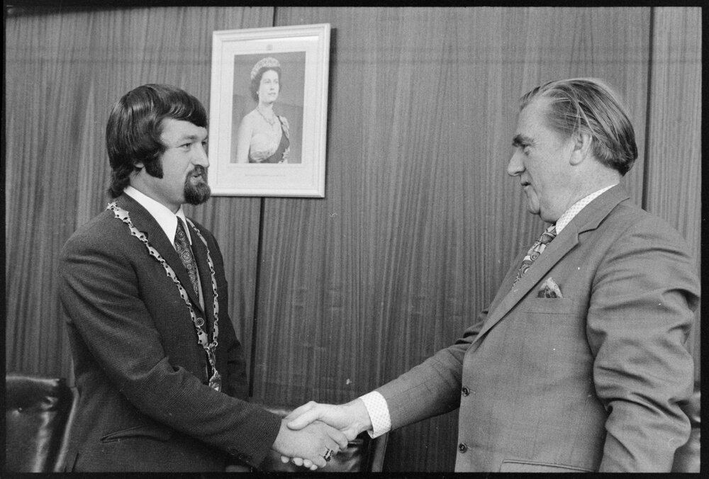 Date1 November 1974Reference Numberphoto gcc-26375DescriptionThe chain of office was placed around the neck of 26-year-old Mr L. K. O'Hara by the outgoing Mayor, Mr R. A. Owens (right). Statutory declarations were then made by the new Mayor and councillors. Published 1 November 1974.FormatNegativePhysical Description35mm black-and-white negative (3/8)Photographer/CreatorBay of Plenty Times