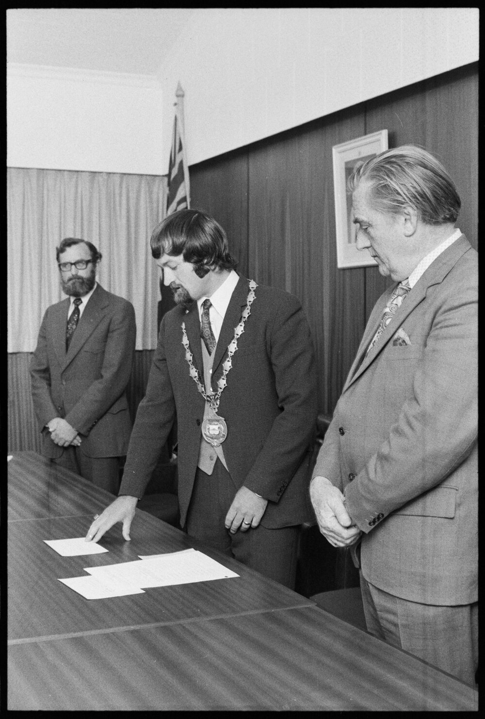 Date1 November 1974Reference Numberphoto gcc-26376DescriptionThe chain of office was placed around the neck of 26-year-old Mr L. K. O'Hara by the outgoing Mayor, Mr R. A. Owens (right). Statutory declarations were then made by the new Mayor and councillors. Published 1 November 1974.FormatNegativePhysical Description35mm black-and-white negative (4/8)Photographer/CreatorBay of Plenty Times