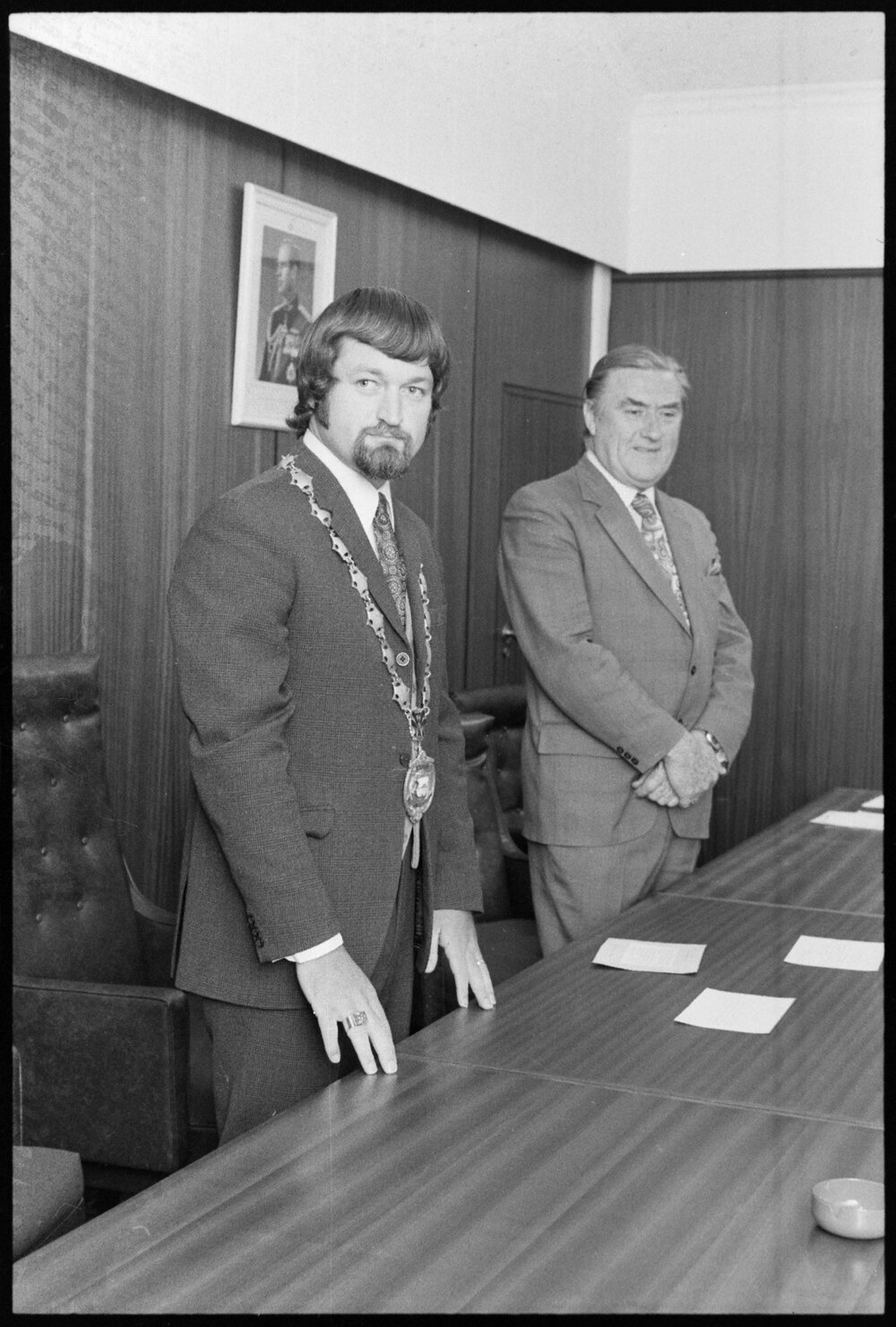 Date1 November 1974Reference Numberphoto gcc-26378DescriptionThe chain of office was placed around the neck of 26-year-old Mr L. K. O'Hara by the outgoing Mayor, Mr R. A. Owens (right). Statutory declarations were then made by the new Mayor and councillors. Published 1 November 1974.FormatNegativePhysical Description35mm black-and-white negative (6/8)Photographer/CreatorBay of Plenty Times