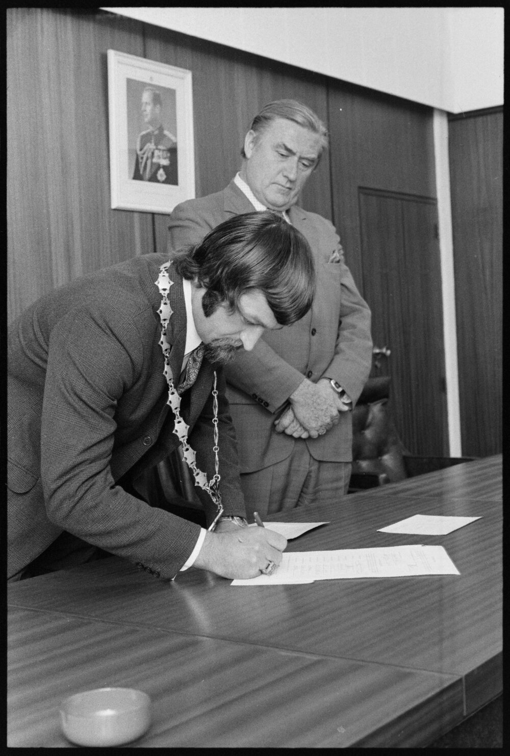 Date1 November 1974Reference Numberphoto gcc-26379DescriptionThe chain of office was placed around the neck of 26-year-old Mr L. K. O'Hara by the outgoing Mayor, Mr R. A. Owens (right). Statutory declarations were then made by the new Mayor and councillors. Published 1 November 1974.FormatNegativePhysical Description35mm black-and-white negative (7/8)Photographer/CreatorBay of Plenty Times