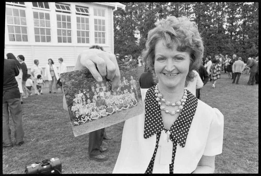 Date29 October 1974Reference Numberphoto gcc-26391DescriptionMrs Frances Week attends the Ōropi School Jubilee. She holds a photo of herself as a primer at Ōropi School in 1947. Published 29 October 1974.FormatNegativePhysical Description35mm black-and-white negative (1/15)Photographer/CreatorBay of Plenty Times