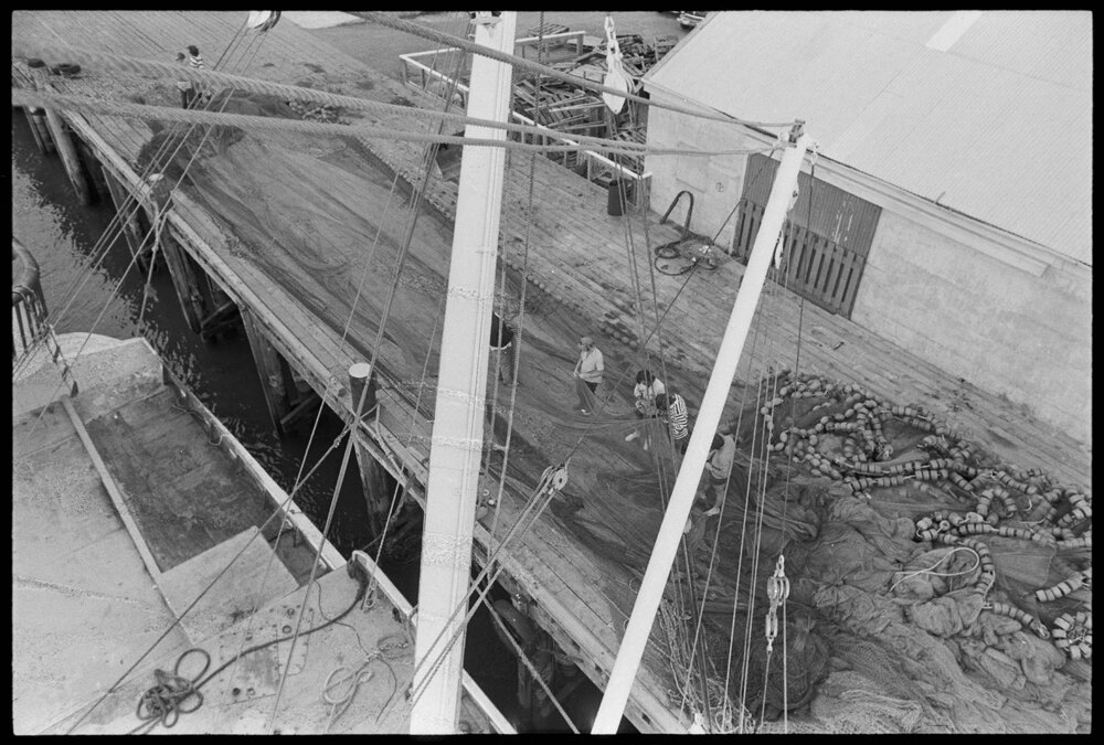 Date29 October 1974Reference Numberphoto gcc-26433DescriptionRepairs to a 2000 foot long net, on the United States research trawler, Paramount at Tauranga. The vessel is conducting investigations into 'pelagic' fishing of the NZ coast. Published 29 October 1974.FormatNegativePhysical Description35mm black-and-white negative (1/8)Photographer/CreatorBay of Plenty Times