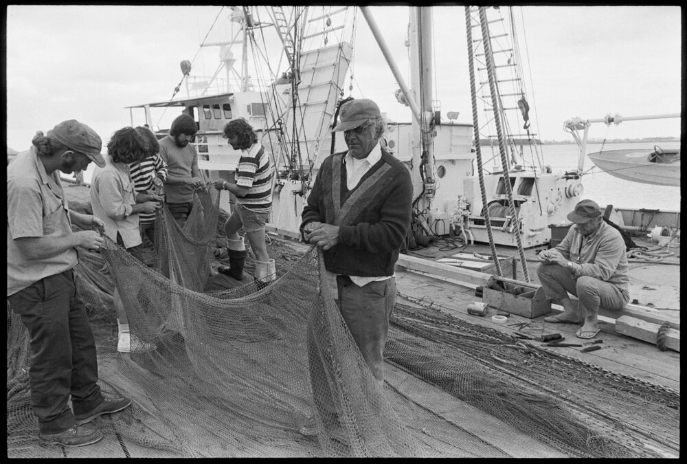 Date29 October 1974Reference Numberphoto gcc-26440DescriptionRepairs to a 2000 foot long net, on the United States research trawler, Paramount at Tauranga. The vessel is conducting investigations into 'pelagic' fishing of the NZ coast. Published 29 October 1974.FormatNegativePhysical Description35mm black-and-white negative (8/8)Photographer/CreatorBay of Plenty Times